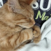 Super friendly young orange tabby, about 5 months old. Seems to be a boy. Very loving, clean but a little skinny — clearly used to people. Has extra toes (polydactyl)!