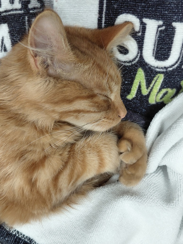 Super friendly young orange tabby, about 5 months old. Seems to be a boy. Very loving, clean but a little skinny — clearly used to people. Has extra toes (polydactyl)!