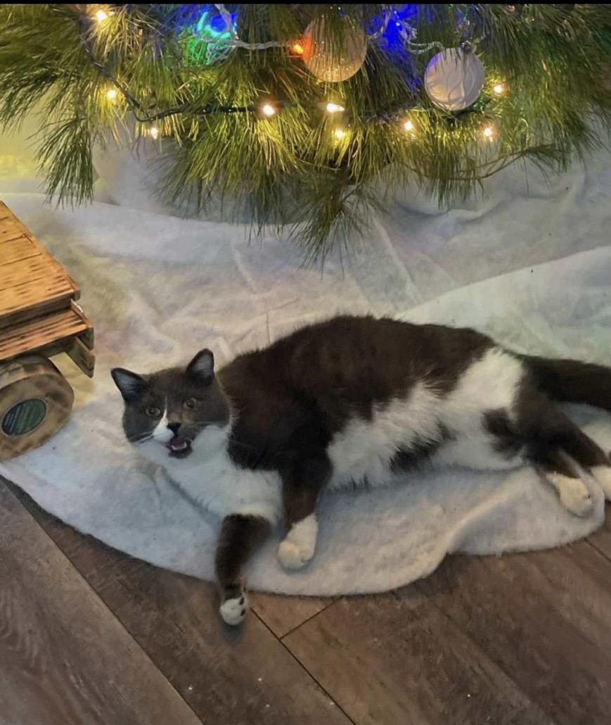 Neutered and ear tipped. Gray and white. Distinctive white mark on his face. Fat and friendly