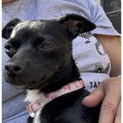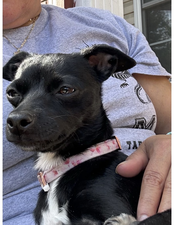Black Chihuahua mix with white fur on belly. Pink collar.