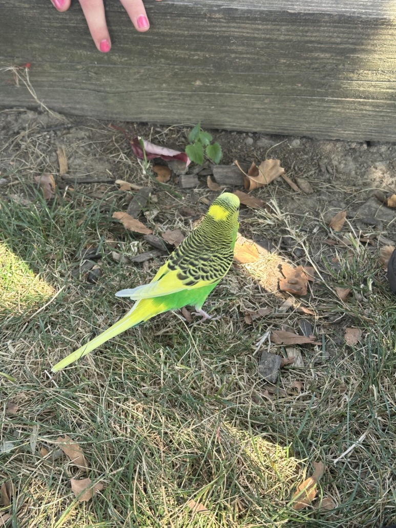 Green/yellow bird, seems very friendly. Clip on foot
