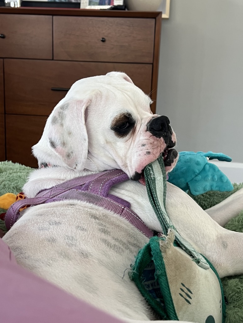 White boxer with black freckle spots, black and brown patch over right eye. Purple harness. Collar with her name and phone number