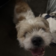 Looks like a medium shih tzu mix tan with leash still attached