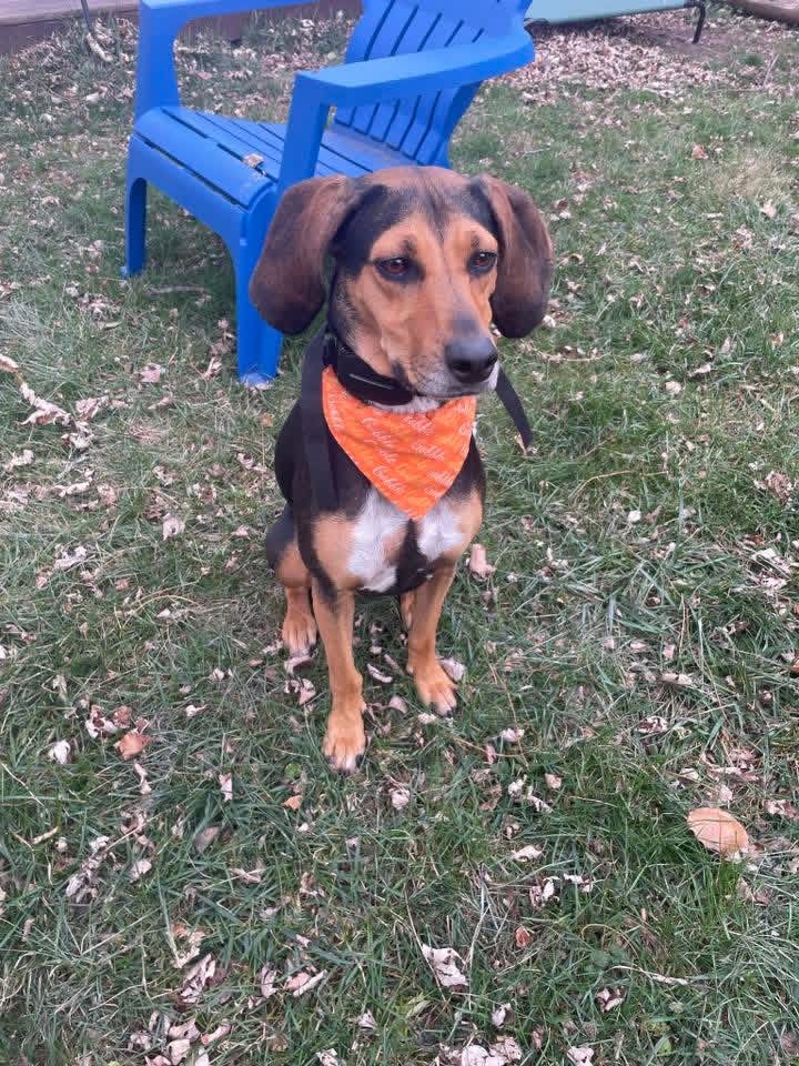 Female hound mix. Black and brown with white on chest. Wearing a bandana. Very anxious but friendly!