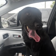 Black lab, seems young, not neutered, nails well taken care of, black patch on tongue
