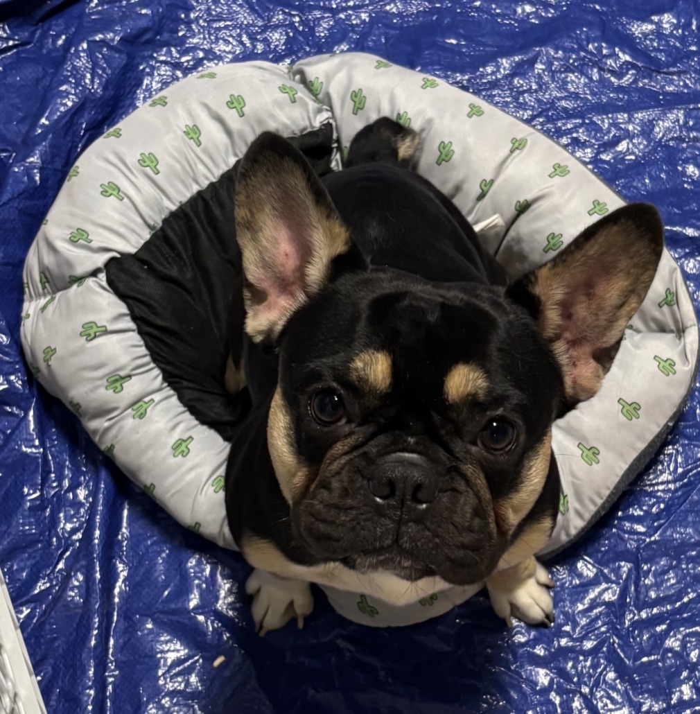 Larger Black and Tan Frenchie. Found at 29th St. and Illinois’s Street near The Children’s Museum. He was running with another dog. The other dog is a small, grey, doodle or havanese type dog.