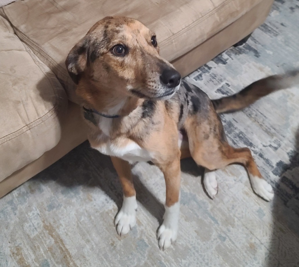 Medium sized male, brindle and Merle coloring. Has collar with phone number on it. He also has a microchip.
