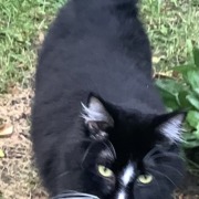 Very light weight and seems hungry. Well kept, meows a lot. Doesn’t want to come inside. Probably female.