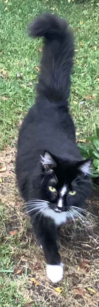 Beautiful long haired cat with big fluffy tail. Mostly black with white feet and white chest/ slight white on nose.