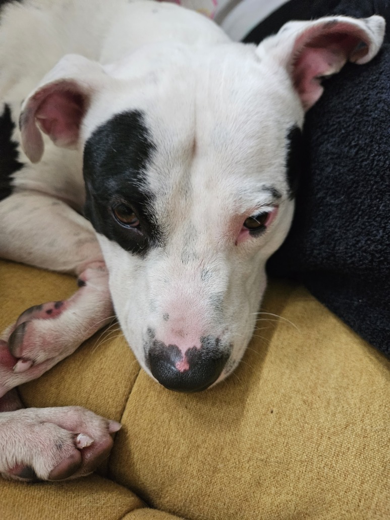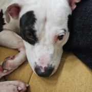 black and white pitbull mix found around the herron-morton area. no chip, no collar, underweight. vet said he is about 1 1/2 to 2 years old.