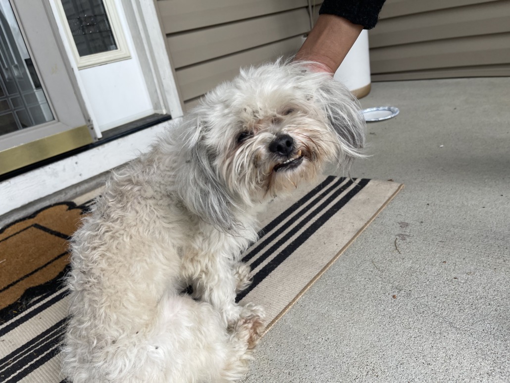 Looks like White Maltese mixed with a shih tzu or maybe poodle