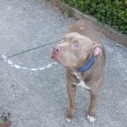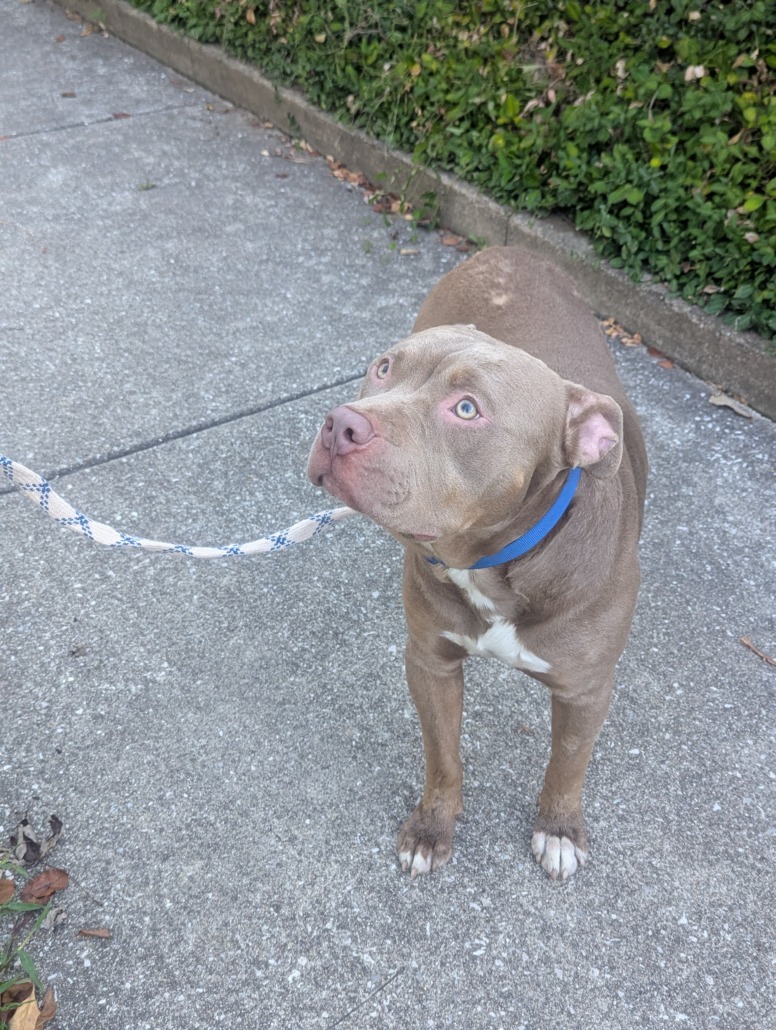 Greyish brown pitbull with white spots on chest, paws. Proof of ownership is required.