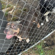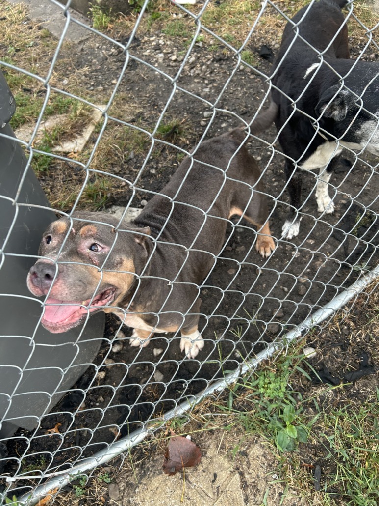 I believe this kind of dog is called a double XL bully he is very stocky. He short he has a big head. He is a try, color brow, gray, and white chest. His ears has been clipped. He does not have a chip. he seemed to be an older dog. he is very sweet and very kind. I see that he’s protective. I have two female dogs and he gets along with them just not when it comes to food. He’s very overprotective when it comes to food he will let you put your hand in the bowl he will let you take the food from him just when another dog is around he gets aggressive