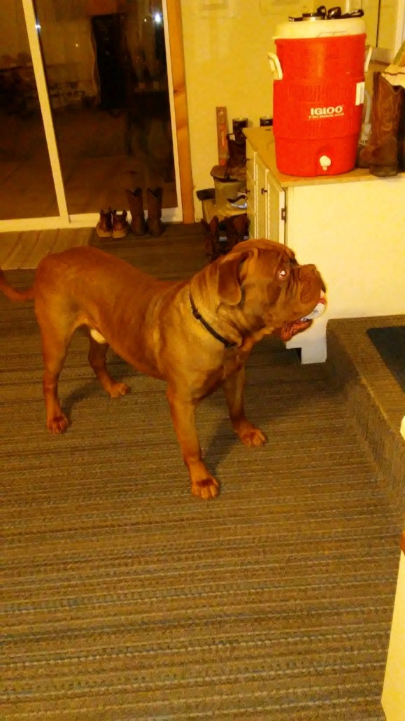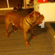 Large red male about 130 pounds. Very gentle dog. Scared of almost everything.