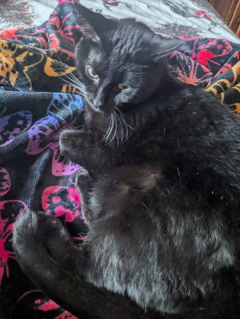Black cat with some sparse white hairs on his chest, fixed, greenish yellow eyes, not really people friendly please don’t try to grab him he WILL bite