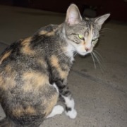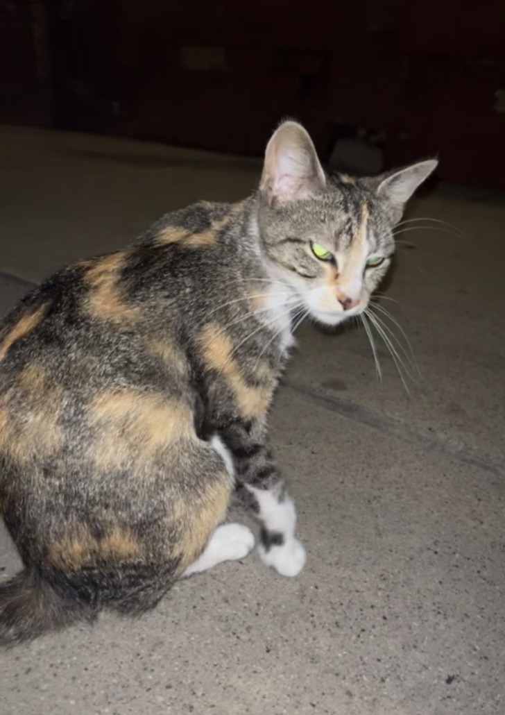 She’s little with stripes and orange spots on her. She has long whiskers and white paws.