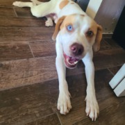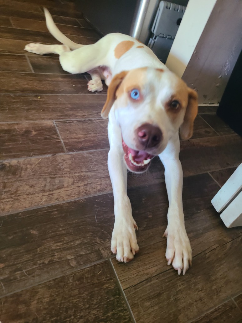 White with tan spots one blue eye and one brown eye. He’s micto chipped to a lady named Hannah but she doesn’t want him so my neighbor and I are taking care of him. He got out of her fenced yard today.