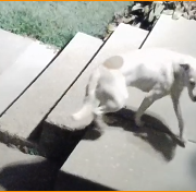 Medium size Pittbull mix, white with a big brown spot around the lower back.