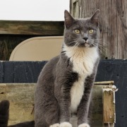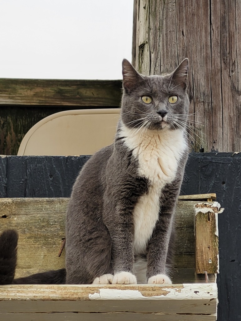 Grey and white super friendly super fit can’t keep weight on her barn cat