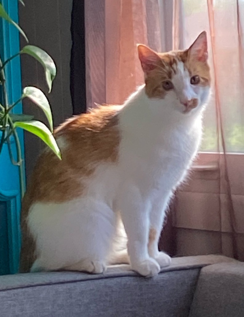 White and orange cat, orange mustache. Loud cough (not sick) raspy wheeze. Clawed.
