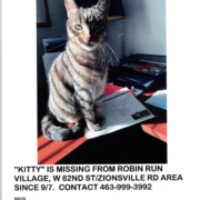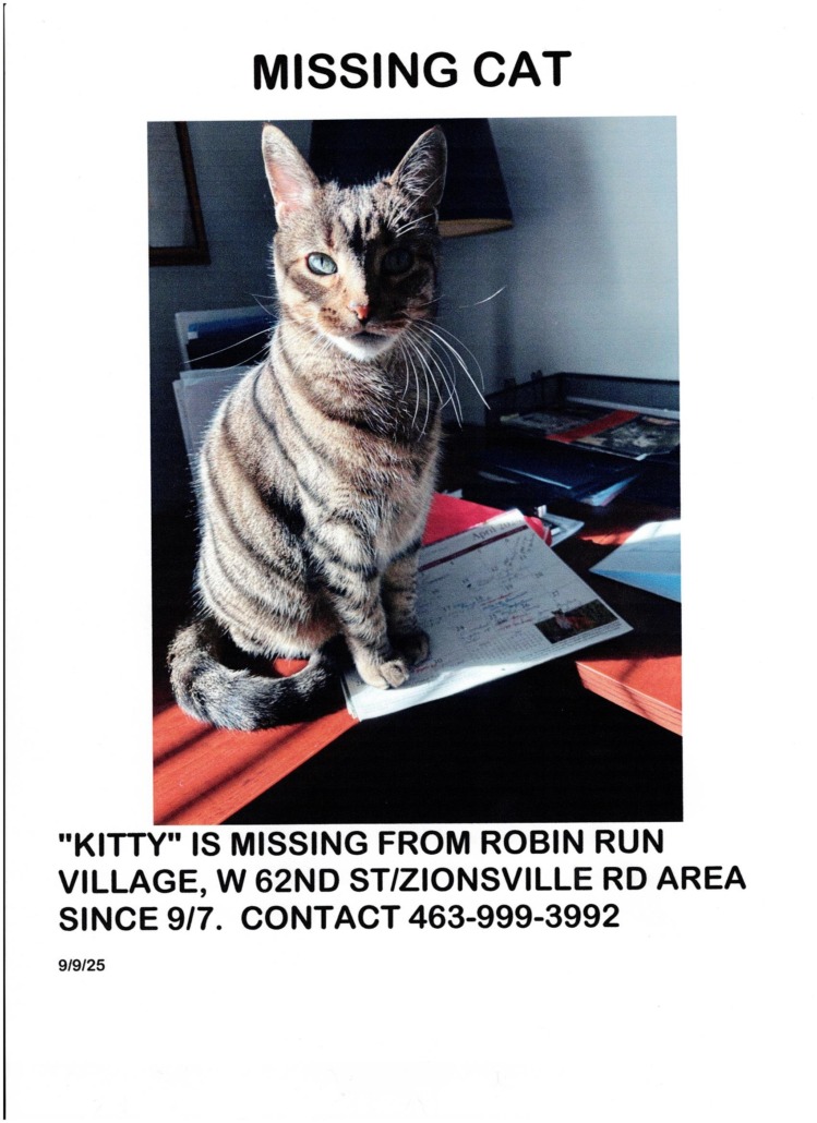 Lost Cat, Alert #91776 Kitty missing near 5354 W. 62nd St. and Red Chalice Rd., Northwest Indianapolis46268