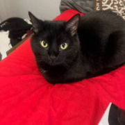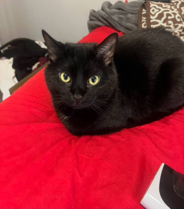 He is very sweet. He has a very small sprinkle of white on his chest and otherwise black fur. About 12-14 pounds when we last saw him. He is on the larger side just size wise.