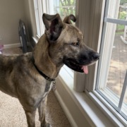 Dolly is approximately 2 years old and a husky/mastiff mix. She is a brown brindle. She got loose in the parking lot of Meijer and ran across Keystone toward the Autozone. She is skittish of men and somewhat timid in generally, but very friendly. She is about 50lbs.