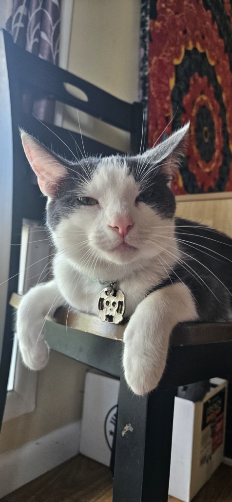 Big 1 year old grey and white tomcat with a tag that says “the catholic church / im really cool / my phone number”