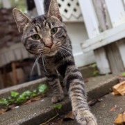 Very friendly, seems healthy and younger (1 year maybe?). Was very hungry when he showed up. Is not fixed. Mixed colors, grays and browns.