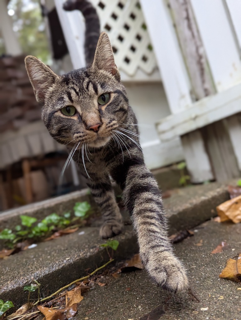 Very friendly, seems healthy and younger (1 year maybe?). Was very hungry when he showed up. Is not fixed. Mixed colors, grays and browns.