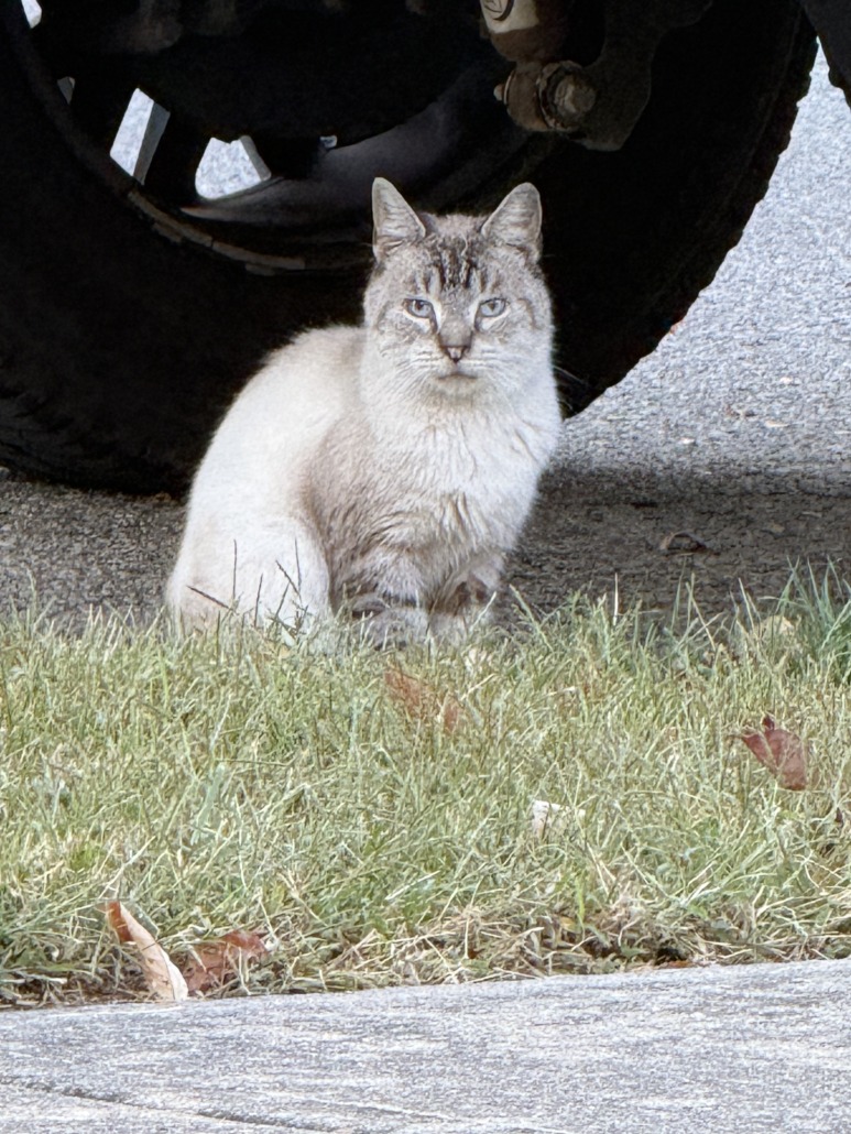 This male (I believe) cat has been hanging around in Brownsburg. He is grey with stripes on his tail and legs. He is thin. He has bright blue eyes. He’s very skittish around people.