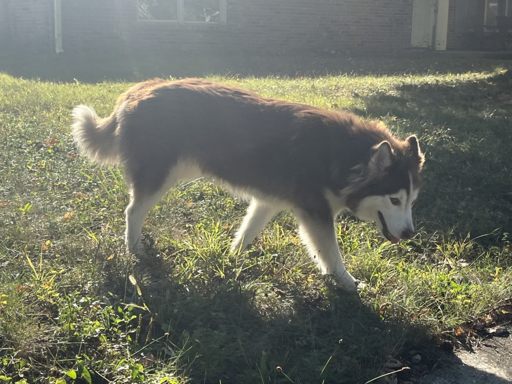 Shy but sweet red/brown husky? Got close but couldn’t touch her. Has collar and is friendly/ interested in other dogs in yards. Tried to grab her but she ran south on Ridgegate