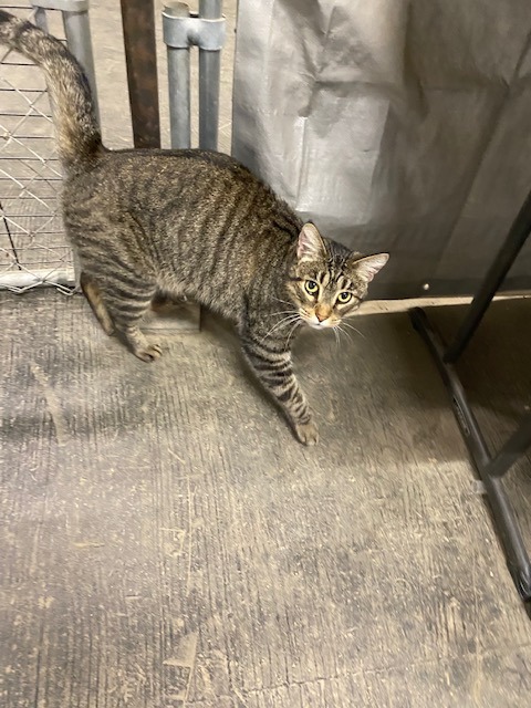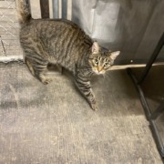 Brown tabby, very friendly, likely 2-5 yr, seems like a housecat, no ear-tip