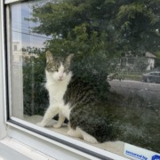 Domestic medium hair. Approx. 8 years old. White and grey with black stripes.