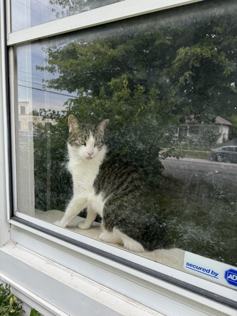 Domestic medium hair. Approx. 8 years old. White and grey with black stripes.