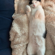 He is a white cat with Black spots. He has a long fluffy black tail. He has a pink nose and he is very friendly.
