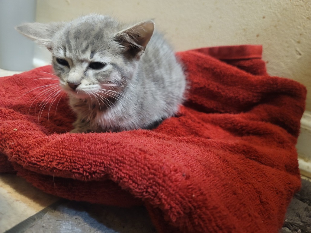 Young female gray tabby kitten, light colored eyes (gray/blue).