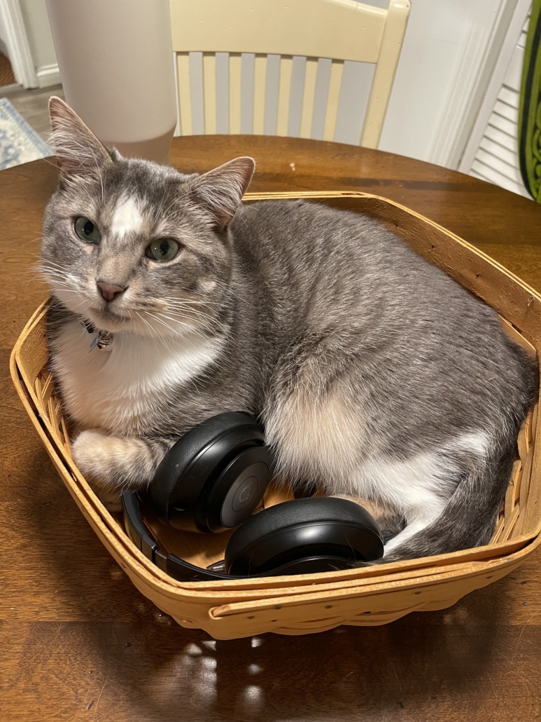 Trouble is a grey and white cat, about 8 lbs. He has a collar on. Has a white patch of white fur on the middle of his forehead and green eyes. White fur on belly and chest and paws