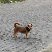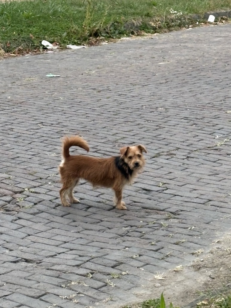 Short, small terrier-looking dog. Mostly brown and tan with a lighter undercoat and black coloring around its neck. Very afraid of people and would get close to driving cars.