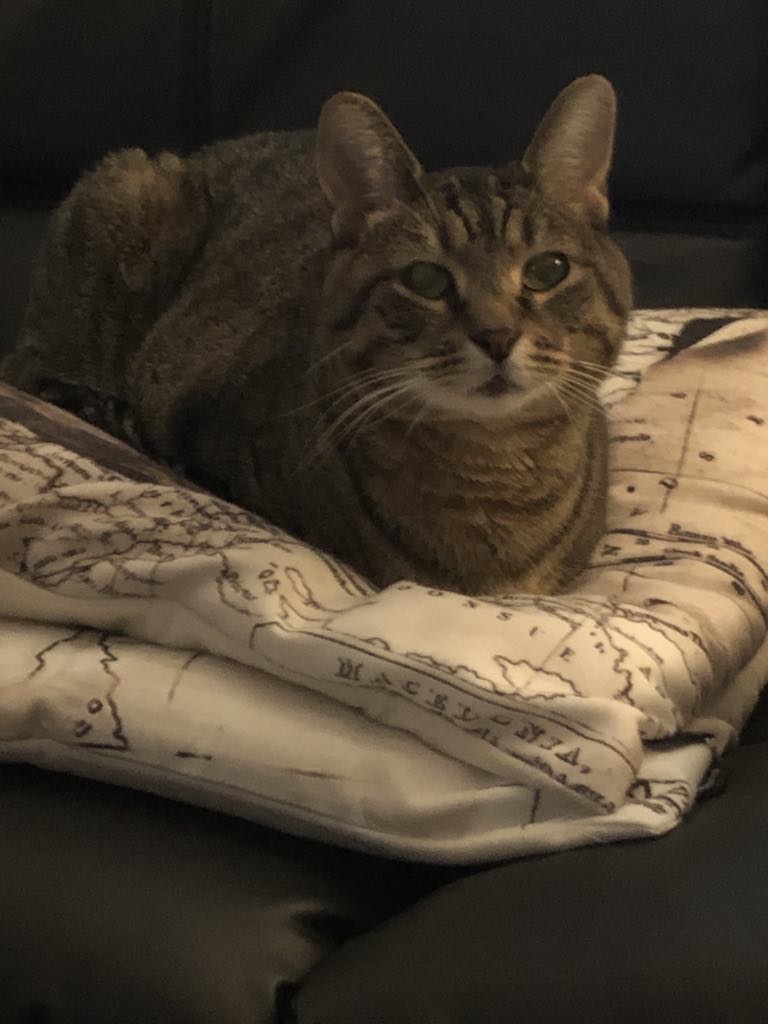 Baby bug is a very small tabby. Very active. She has been declawed (adopted that way) always indoors in a second floor apartment.