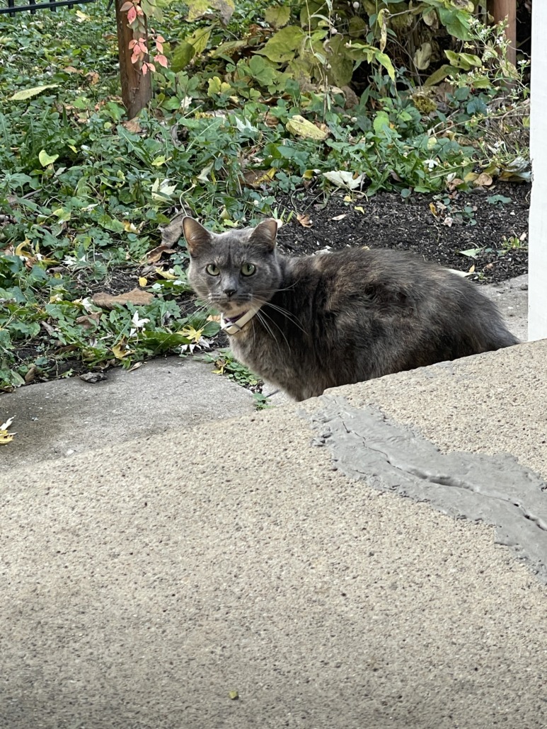She’s a dilute tortie with a flea collar and a pretty heavy ear tip. She’s very skittish and won’t let me come near but is staying near my house