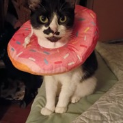 Jinx is a kitten she is currently wearing a donut collar(cone). She was a stray kitten who came up to me and sat in my lap I’ve been treating her for fleas.