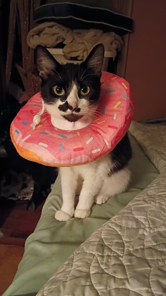 Jinx is a kitten she is currently wearing a donut collar(cone). She was a stray kitten who came up to me and sat in my lap I’ve been treating her for fleas.