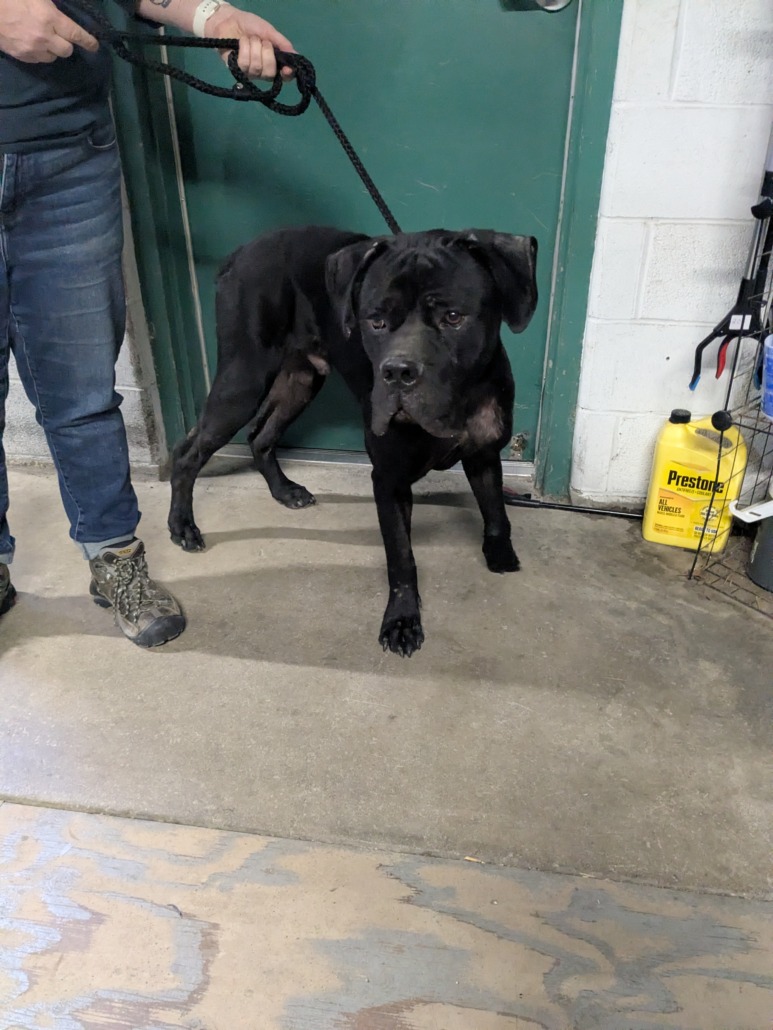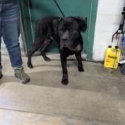 Thin black cane corso with white markings on chest.