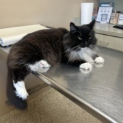 Axel is black white under neck and on paws. She may be skiddish as to she never leaves the house, snuck out through the door. She has some hair missing on her back and tail due to a skin issue that I am treating so it is critical she is returned back. She will come for wet food.