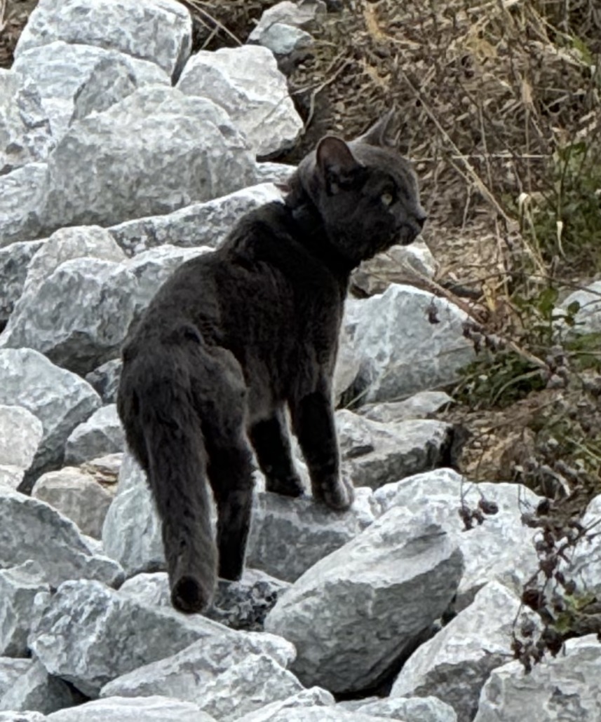 Very skinny mostly or all gray cat seen eating Panera trash on side of the road. Lost sight when it went down the hill into the brush. Seemed to have a limp but was still moving quickly and seems familiar with the area. Has a collar or something on, but looks pretty worn out. Near the south bound on ramp for I-69