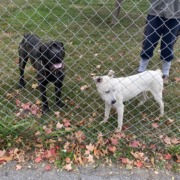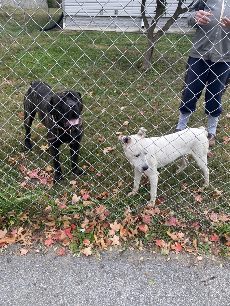 White pit mix- no collar and brindle mastiff- large spike collar