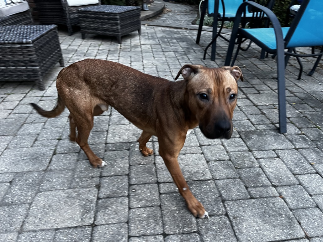 Very friendly boy found trying to follow people home in the park. He is underweight. He is a pit mix about a year old.