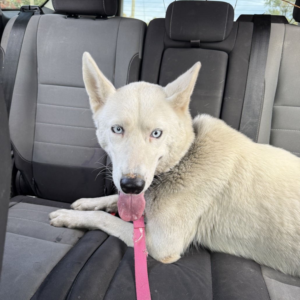 White husky (or husky mix). One small brown/black spot and one tiny black/dark brown spot on back by tail. Crystal blue eyes. Very thin. Black collar that has worn the neck hair down a lot. Friendly, but scared. May have hearing loss?