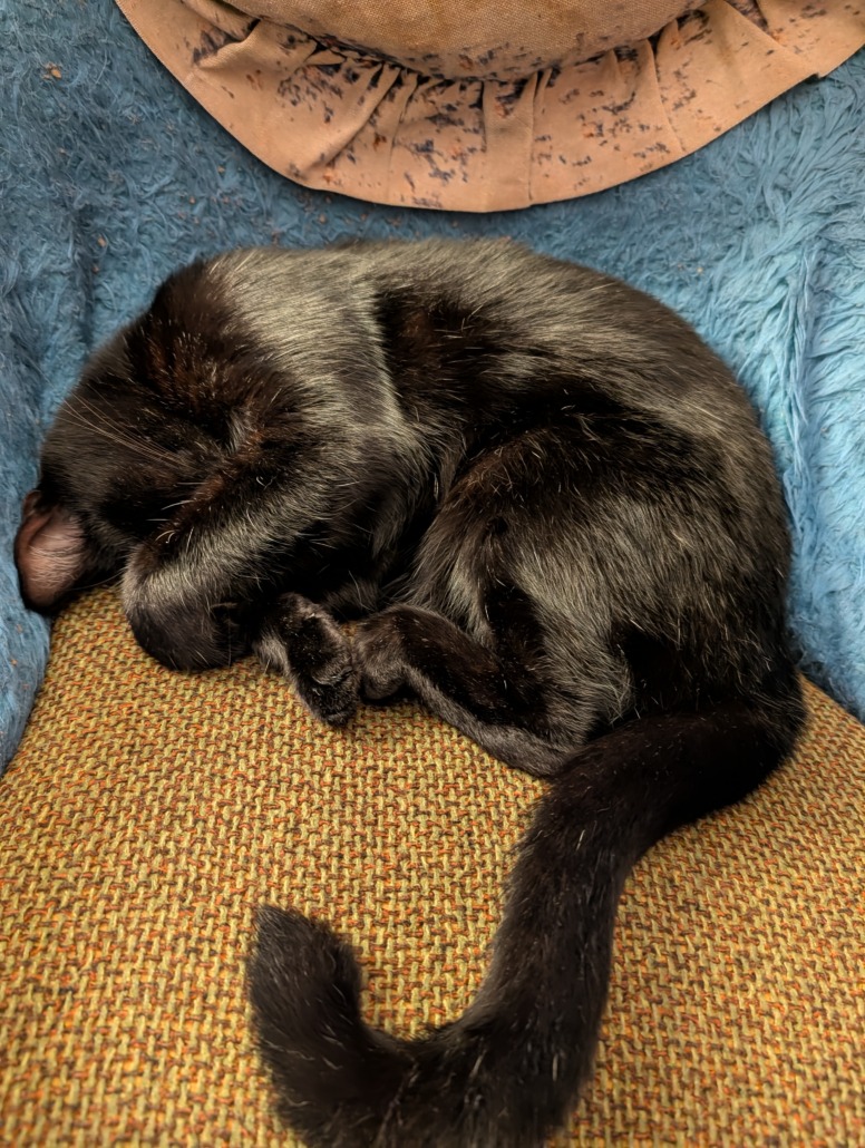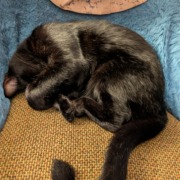 Short hair medium black cat with thin white patch on upper chest. Ear is not clipped, but she is fixed.